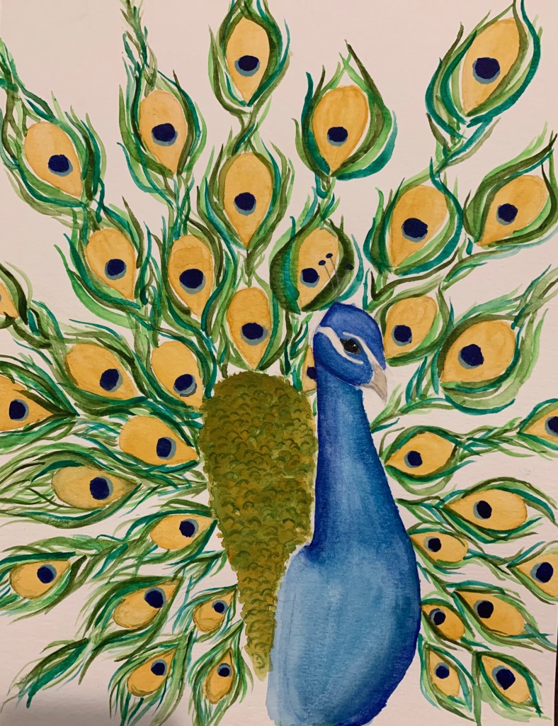Hi readers! I know it’s been a while since I last posted, since I have been working on one of the largest watercolor pieces I have ever created, which is shown above. This piece took a lot of time, approximately a week in total. For this painting, I used Articci watercolors, which I highly recommend for watercolor projects. An image of the watercolor box is given below. The watercolors also came with a brush, a water brush which allows the artist to dilute the paint as they go. Using this brush, I was able to create thin lines, curved lines, lines that go from thick to thin, and blend the colors. This brush, of which an image will also be provided below, is a necessary tool when it comes to watercolor. I started with sketching the outlines of the body & the feathers of the peacock. For the head and body, I looked at pictures of real peacocks and observed that they had small, narrow heads with long necks that started out thin and quickly grew thicker closer to the base. Imitating that, I moved on to the greenish ruffle under the feathers. A teardrop shape works best for this. For the feathers, I started off drawing lines going outwards, and lightly sketched upside-down teardrop shapes distanced by an inch. To paint this piece, I used the colors white, ultramarine blue, cerulean blue, cobalt blue, emerald green, sap green, viridian, hooker’s green, yellow ochre, and black. The body was a blend of ultramarine blue and cerulean blue, and the ruffle was a mix of hooker’s green and yellow ochre. The center of the feathers is lightened yellow ochre, with a spot of ultramarine blue outlined with a pale cobalt blue. The green part of the feathers included all the shades of green: emerald green, sap green, viridian, and hooker’s green. Using the water brush I mentioned above, I made curved strokes going from thick to thin starting at the base of the yellow ochre teardrop shape and going up. This step takes a while, which is what took me a while. The details on the face were the hardest part, so I used a picture of a peacock as a reference.