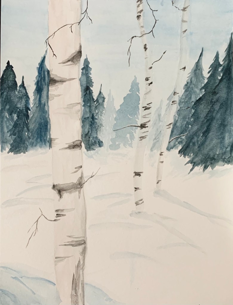 Hi! This is a new watercolor piece I’ve been working on and it’s really easy to do. First, create the the spaces for the trees and the line where the sky meets the ground. I would recommend using easily peeling tape for this step. Then, paint the sky, making a gradient. Add the pine trees in the back, making them fade in from each side, giving the scenery depth. Next, lift the tape and paint the birch trees with a pale gray and add strokes of pale blue-gray to define the snow. Add details to the birch trees and soften the line between the snow and the trees in the bathroom. That’s all! This was a quick, simple project, so you can do it anytime. Hope this inspired you!
